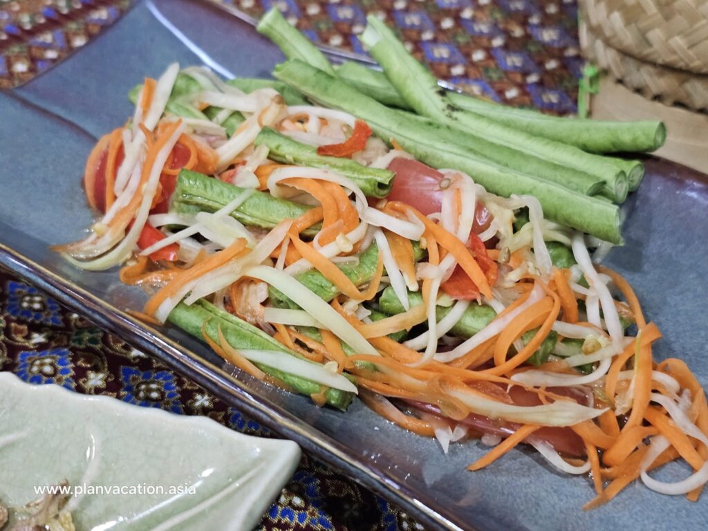 3. Mix with vegetables and protein: Add yardlong beans, tomatoes, peanuts, dried shrimp, and shredded green papaya to the mortar. Mix well until all ingredients are evenly coated with the seasoning.